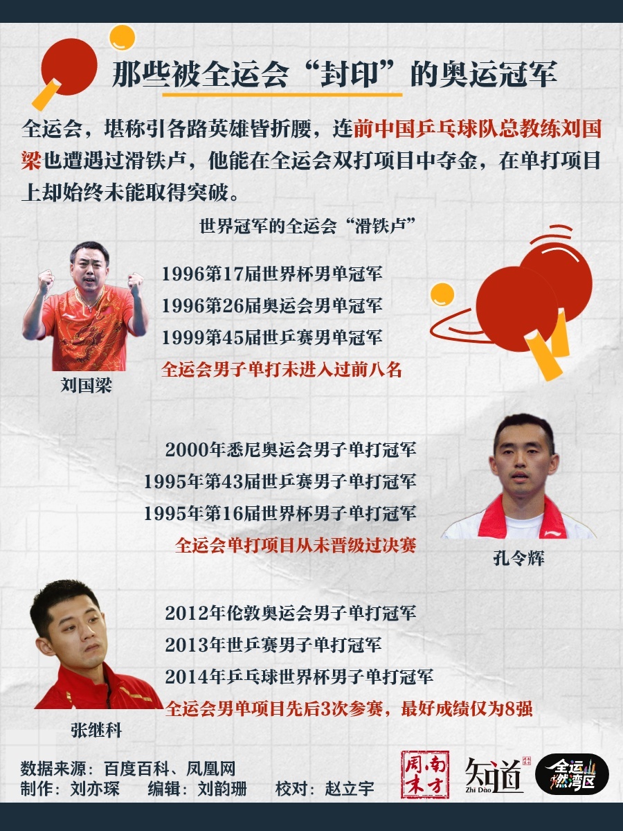 前中国乒乓球队总教练刘国梁,虽然在世界杯、奥运会、世乒赛上实现男单“大满贯”,却从未进入全运会男单前八。同样完成“大满贯”伟业的张继科,三战全运会男单项目,最佳成绩也仅止步于八强。